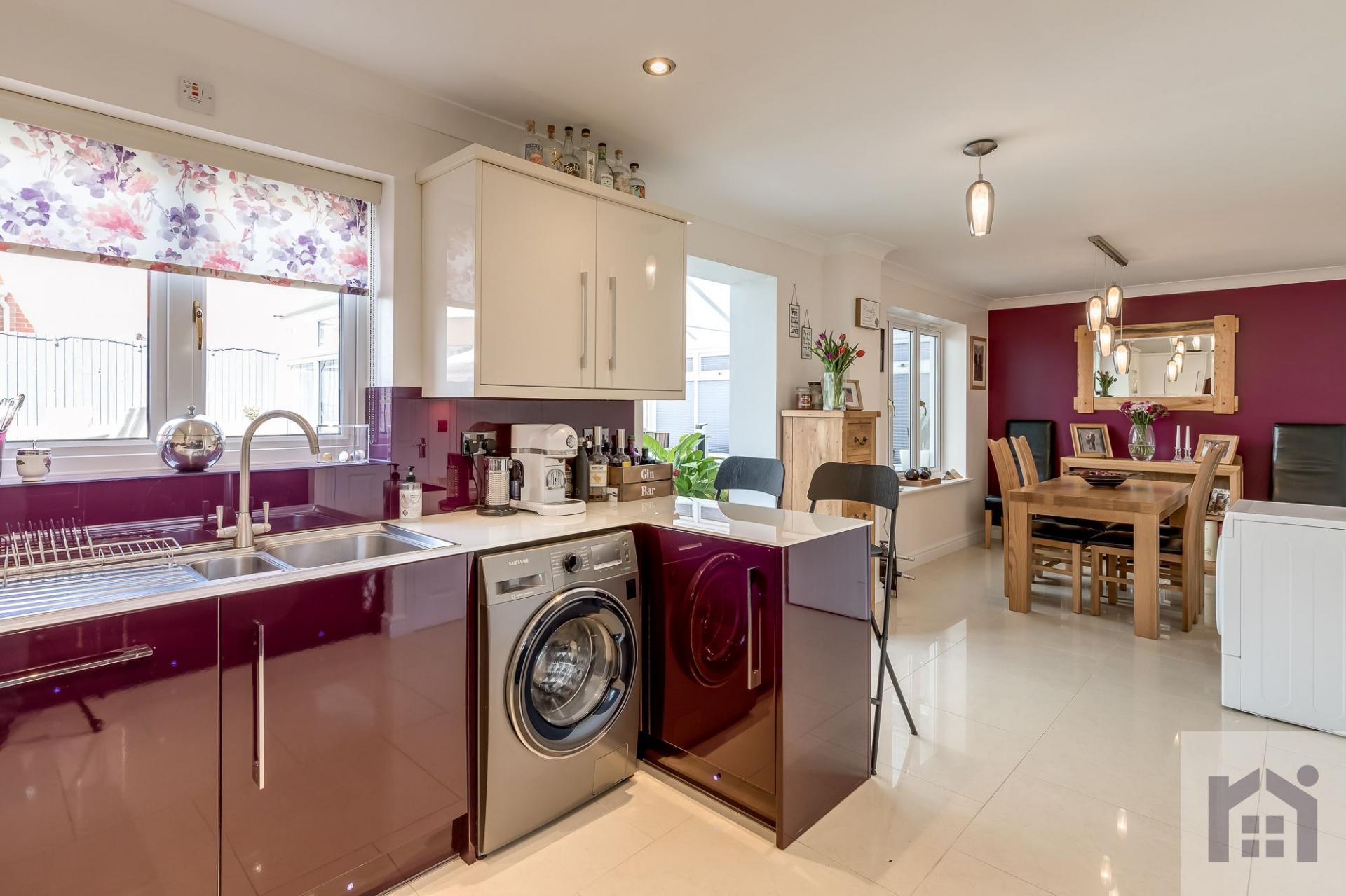 To the rear, the heart of the house takes the form of a good sized dining area, kitchen with a range of wall and base units topped with toughened glass work surfaces and benefiting from under cupboard and kickboard lighting, with integrated appliances including double electric oven and grill, refrigerator and freezer, microwave, dishwasher, wine cooler and space, power and plumbing for additional appliances. Leading off is the magnificent garden room, with SuperLite Extralight Lightweith roof tile system, overlooking the garden.