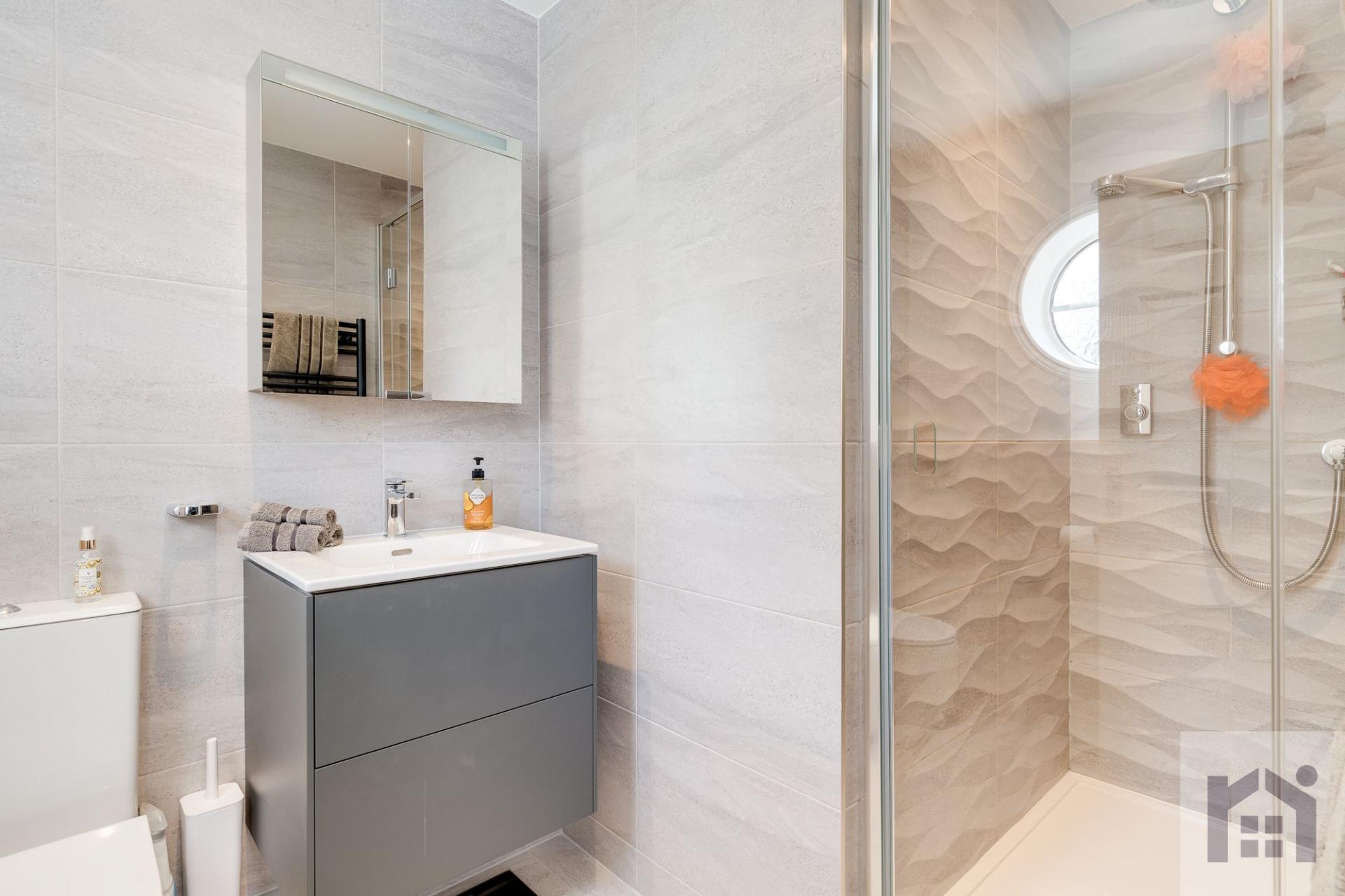 Completing the ground floor is reception four/bedroom five with en suite in a wet room style comprising electric shower in walk in cubicle, wc, floating wash hand basin and ladder heated towel rail.