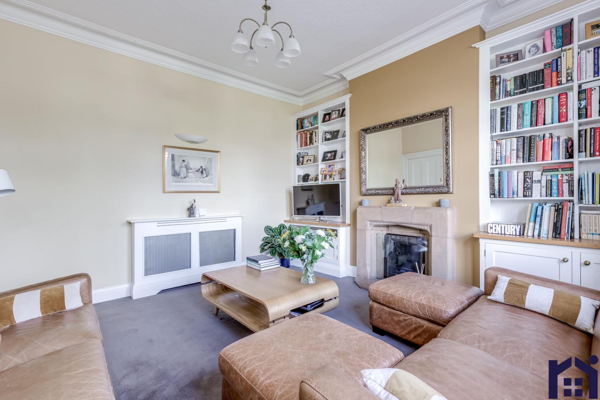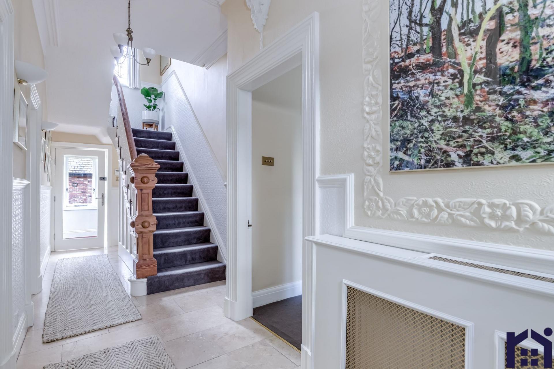 Mature hedging screens the block-paved front garden with private seating area leading to the imposing main entrance. Step into the vestibule and from there to the welcoming hallway with travertine flooring and Lincrusta wall coverings.