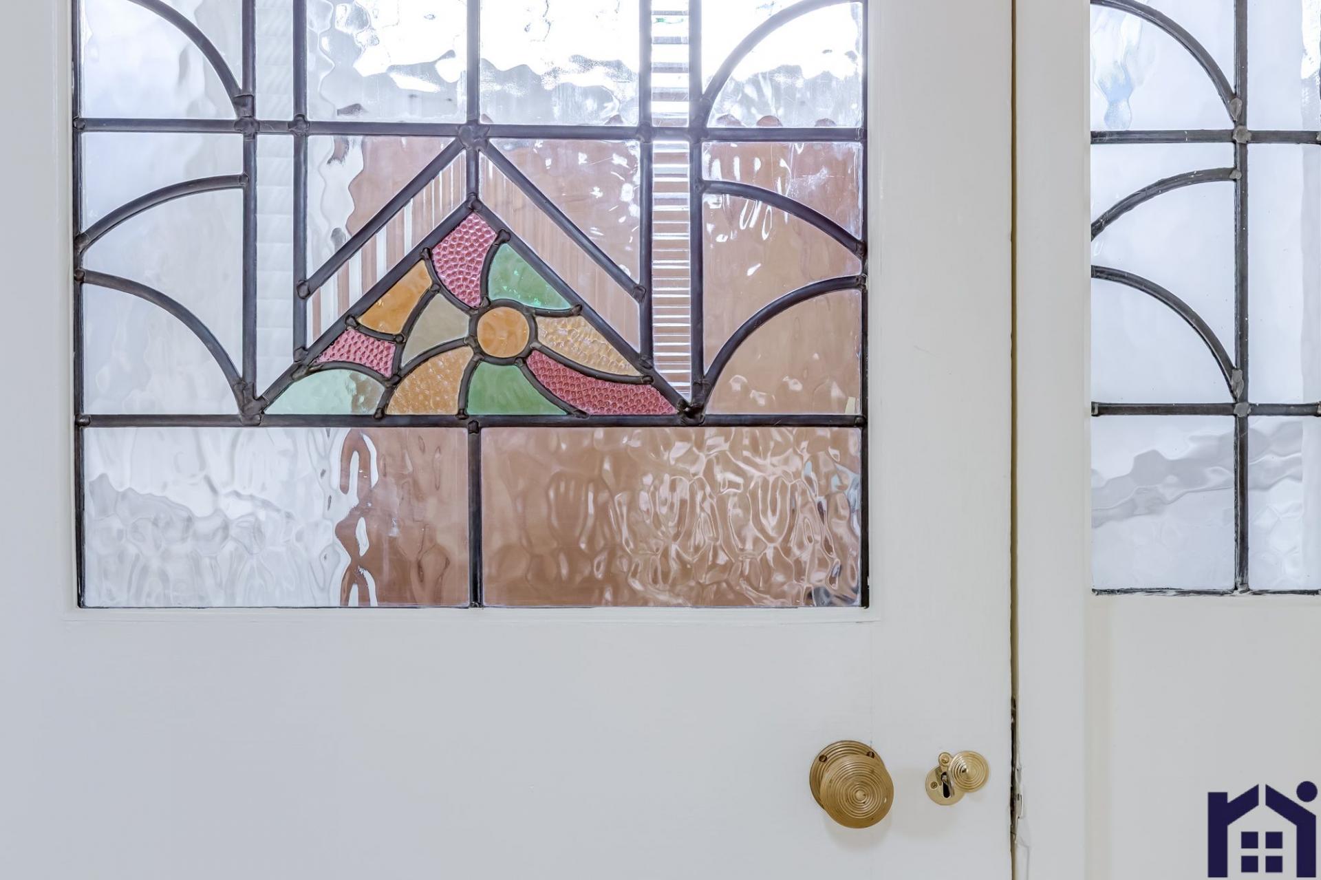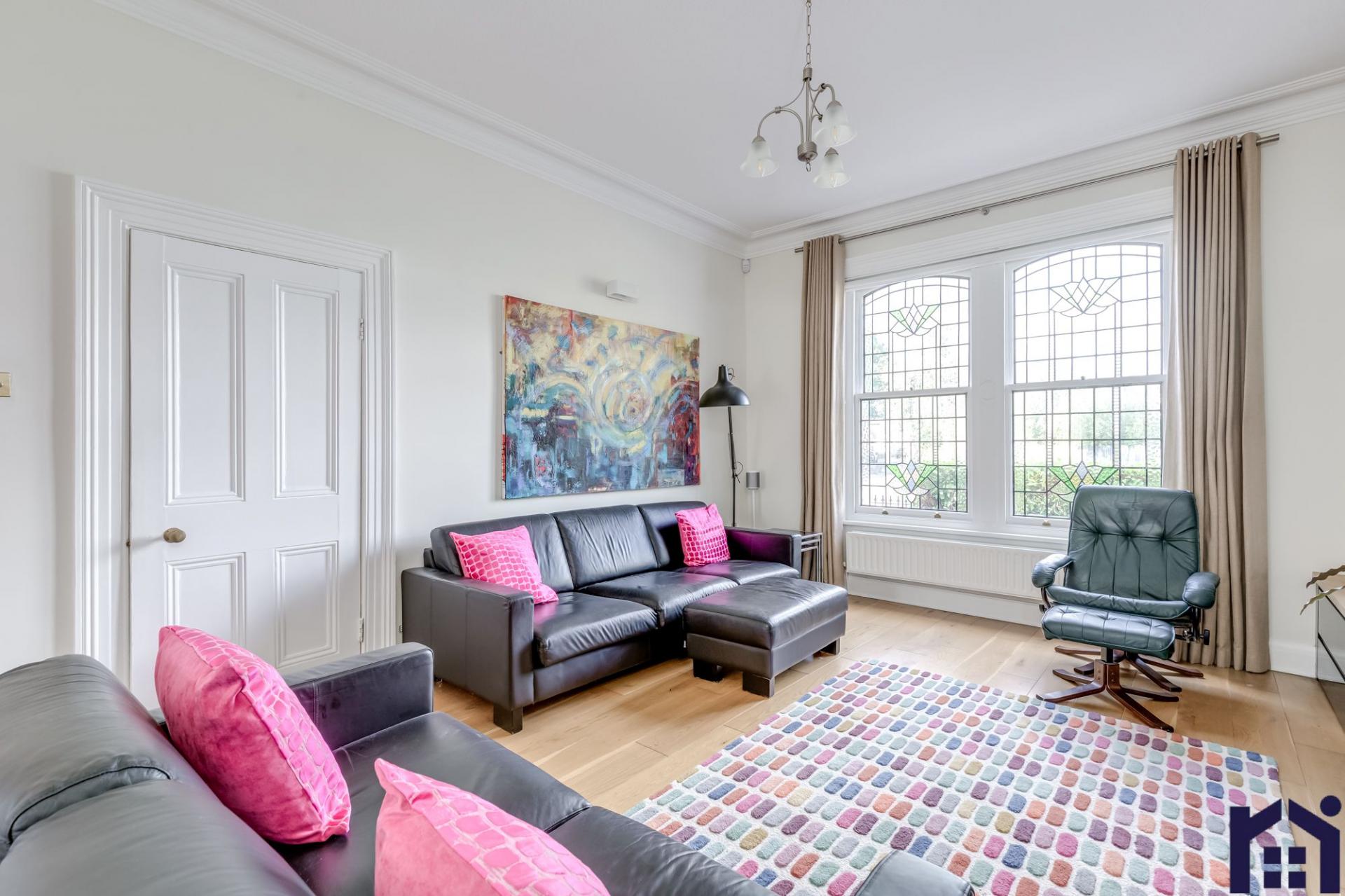 To the right is the formal period sitting room with open fire in stone hearth whilst to the left is the living room with a more modern twist, stained glass sash windows and remote controlled inset electric fire.