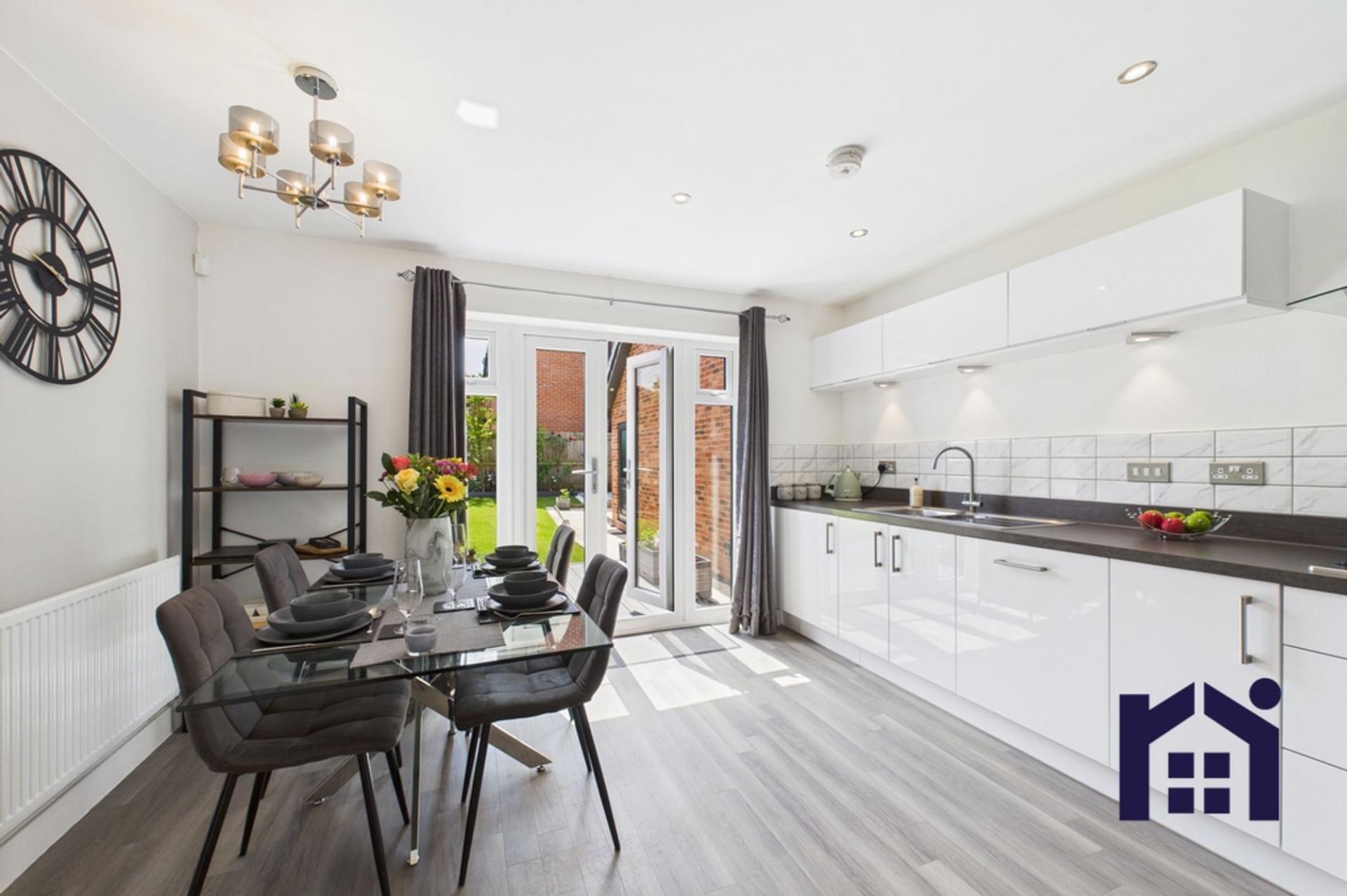 To the rear of the property, the spacious living room features french patio doors that open onto the garden. The kitchen/diner includes a range of wall and base units with integrated appliances: a five-burner gas hob, double electric oven and grill, refrigerator, freezer, and dishwasher. Additional french patio doors allow for seamless indoor-outdoor living.