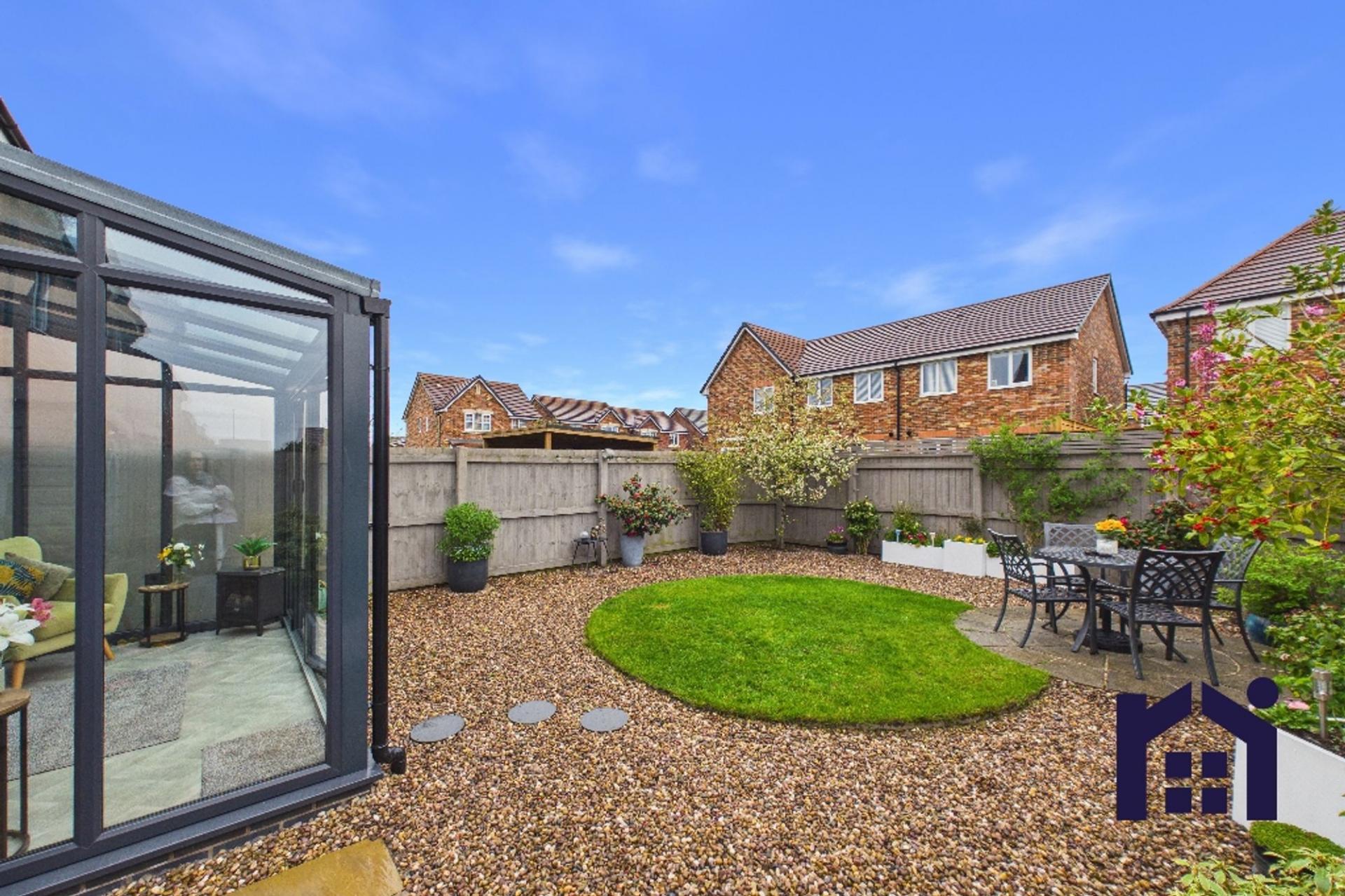The cloakroom features a wc and wash hand basin, while to the rear, the well-proportioned living room flows seamlessly into the garden room, where bi-fold doors open onto an Indian stone sun terrace. This leads to a lawn with gravel borders, raised beds and beautiful blossom trees, including crab apple and cherry, with a large shed providing excellent storage.