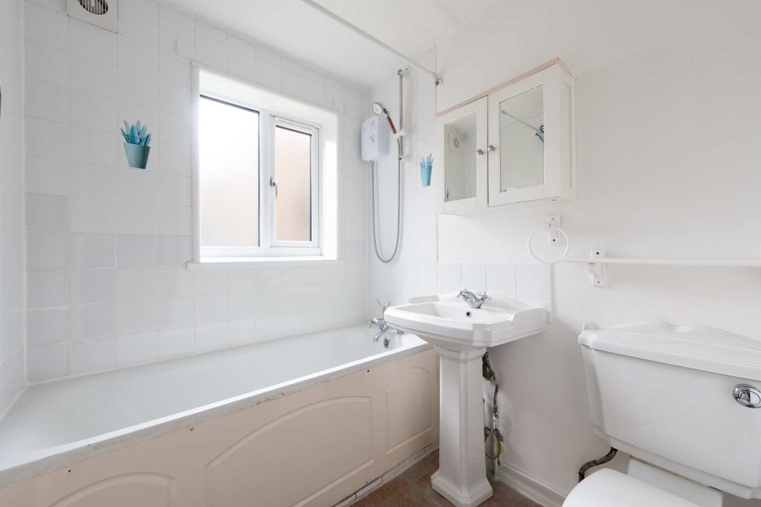 Next, the good-sized bathroom includes a three-piece suite comprising of WC, pedestal basin with mirrored storage above, and bathtub with electric shower. There’s full-height tiling around the bathtub and a tiled splashback to the basin.