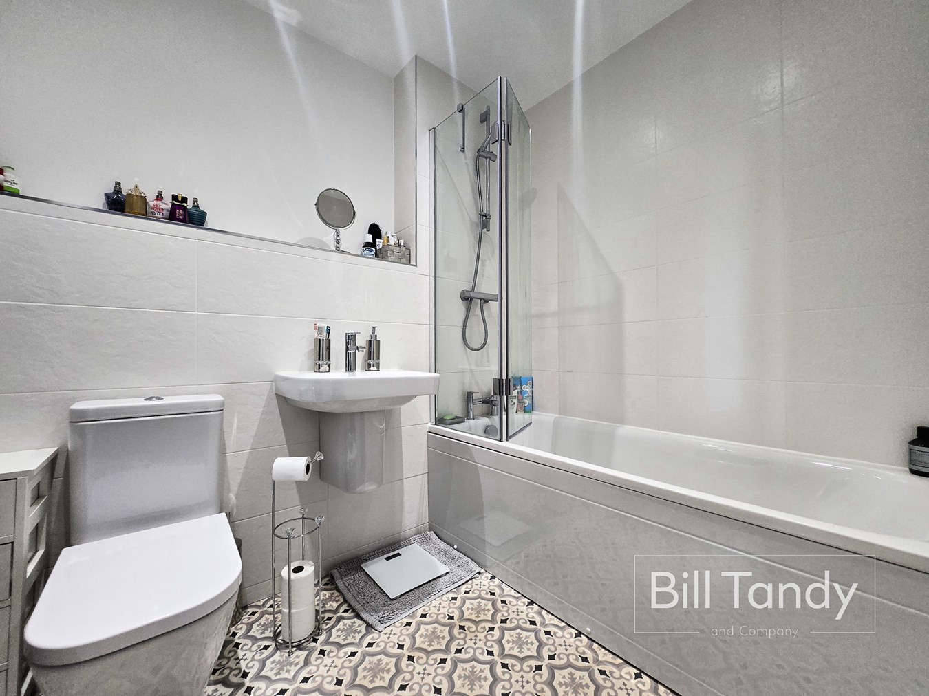 2.25m x 1.90m (7' 5" x 6' 3") having chrome heated towel rail, ceiling spotlighting and modern white suite comprising Roca wall mounted wash hand basin with tiled surround, low flush W.C. and bath with shower appliance over and shower screen.