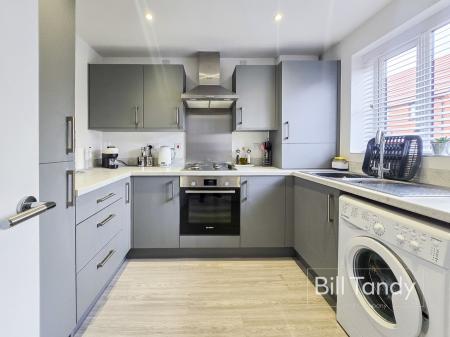 2.79m x 2.75m (9' 2" x 9' 0") having a range of modern grey cupboards comprising base cupboards and drawers with round edge work tops above and matching upstand splashback surround, wall mounted cupboards with under-cupboard lighting, inset stainless steel one and a half bowl sink with drainer, inset Bosch oven with four ring gas hob, stainless steel splashback and Bosch extractor fan above, integrated fridge and freezer, spaces ideal for washing machine and dishwasher, laminate floor flowing through from the hall, ceiling spotlighting, radiator and double glazed window to front.