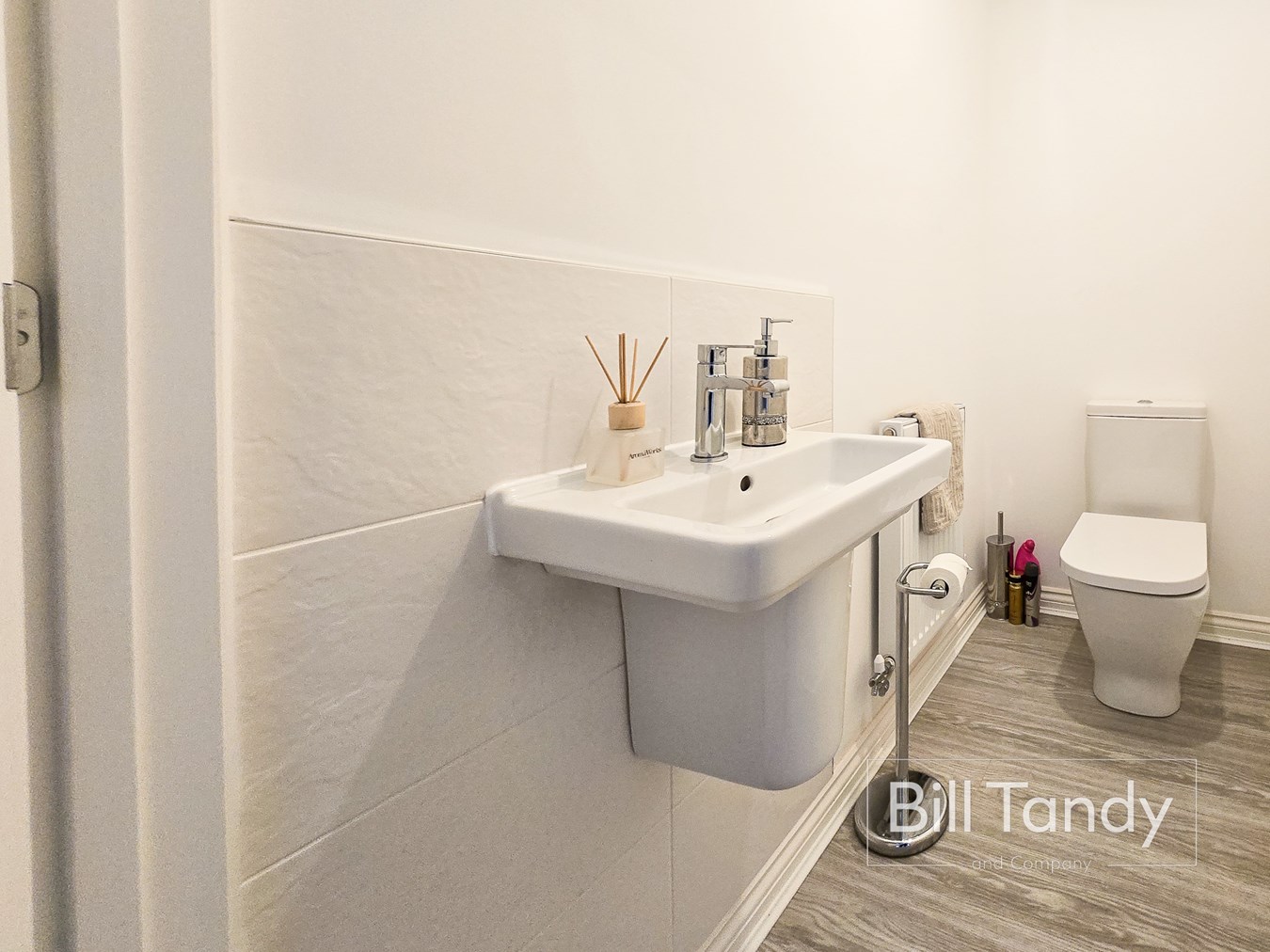 having laminate floor flowing through from the hallway, radiator and modern white suite comprising Roca wall mounted wash hand basin with tiled surround and low flush W.C.