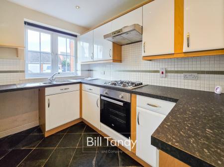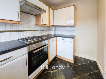 2.90m x 1.92m (9' 6" x 6' 4") having double glazed window to front, slate style tiled floor, radiator, spotlighting to ceiling, modern kitchen units comprising base cupboards and drawers with preparation work tops above, mosaic style tiled splashback surround, wall mounted cupboards, inset one and a half bowl stainless steel sink, inset Beko oven and Whirlpool gas hob with extractor fan above and spaces ideal for washing machine and fridge/freezer.