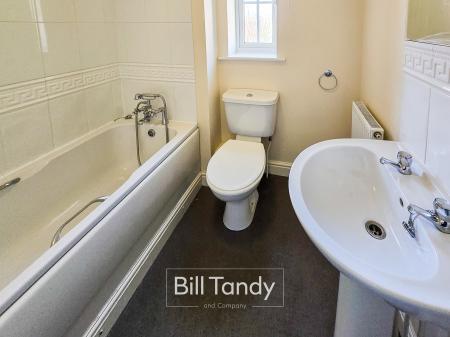 1.95m x 1.91m (6' 5" x 6' 3") having obscure double glazed window to side, radiator and suite comprising pedestal wash hand basin with tiled surround, low flush W.C. and bath with shower head attachment and tiled splashback surround.