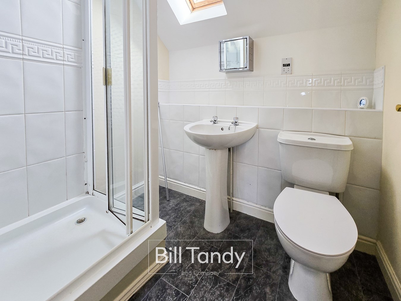 having skylight window to rear, radiator and modern white suite comprising pedestal wash hand basin with tiled surround, low flush W.C. and shower cubicle with shower over.