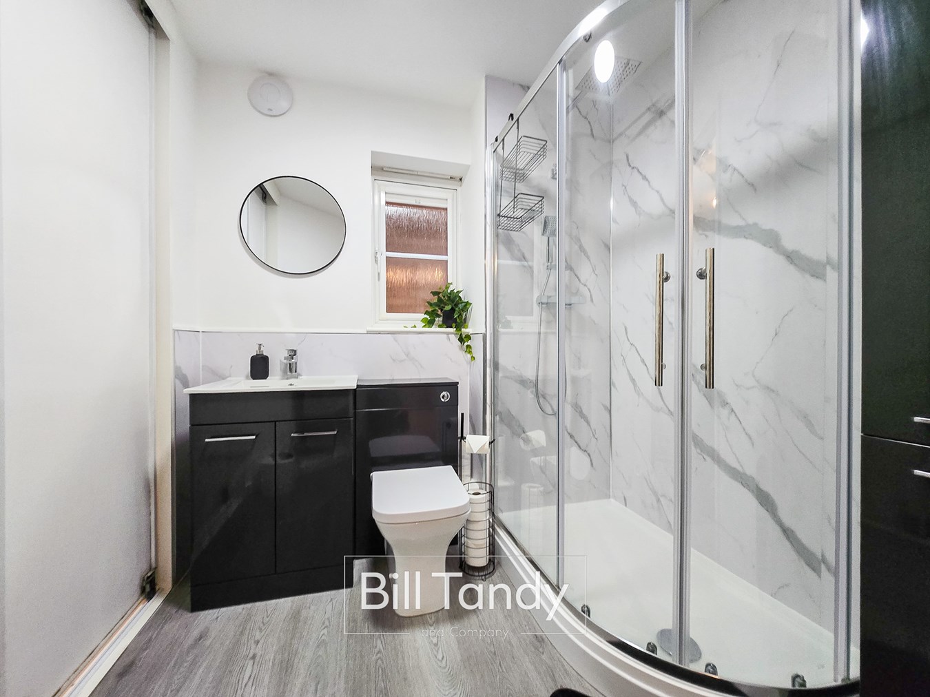 2.51m max x 2.16m (8' 3" max x 7' 1") this Jack and Jill shower room is accessed from both the sitting room and the main bedroom having an obscure double glazed window to side, towel rail, contemporary suite comprising anthracite grey gloss vanity unit with inset wash hand basin and low flush W.C., generous shower enclosure with twin-headed shower appliance over, marble style aqua-boarding surround and laminate floor.