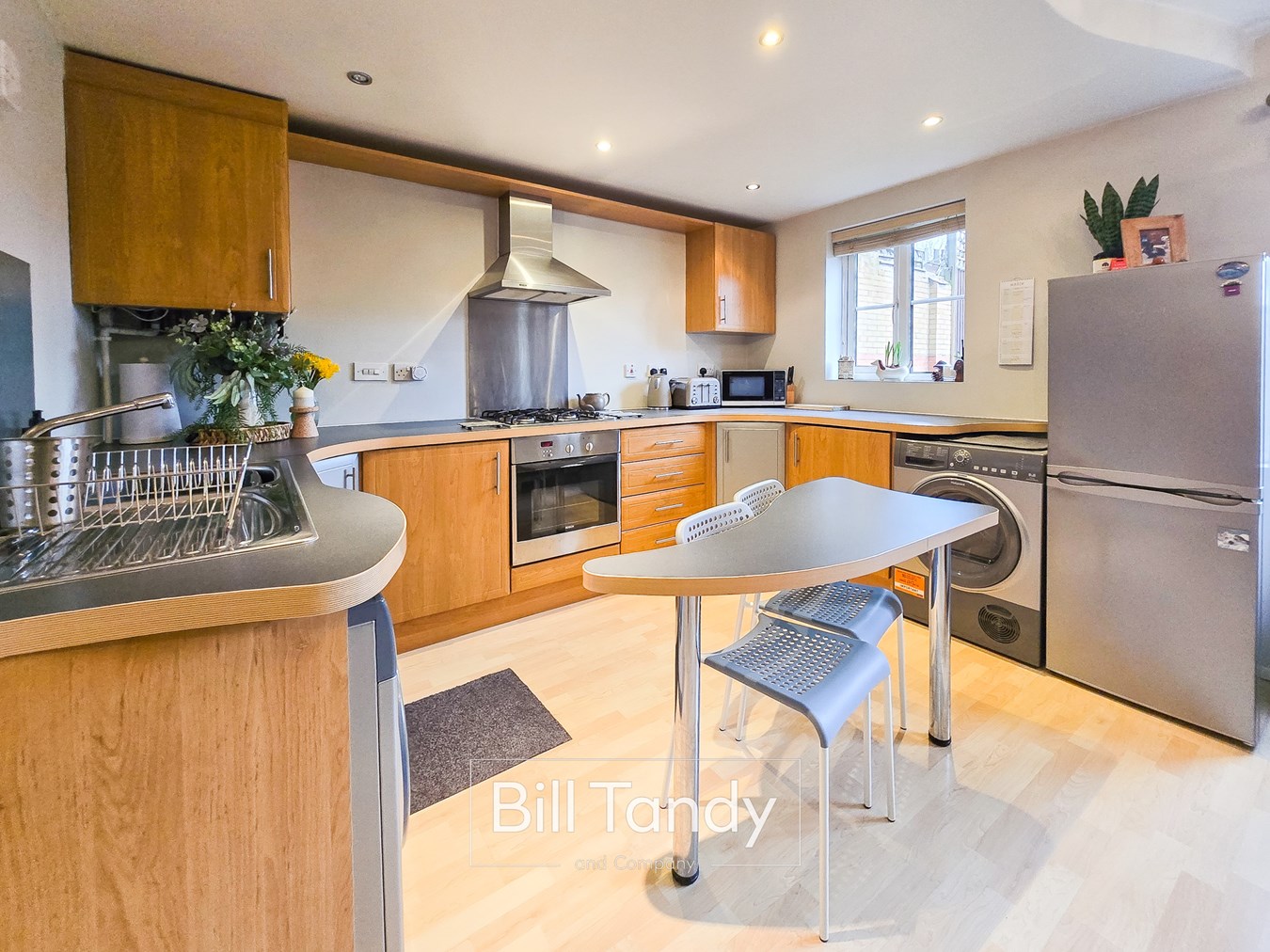 5.82m max x 5.16m max (19' 1" max x 16' 11" max) an 'L' shaped room having both a sitting area and open plan kitchen comprising two double glazed windows to rear, laminate floor, two radiators, spotlighting and useful store cupboard. The kitchen area has spotlighting to ceiling, laminate floor flowing through from the sitting area, modern kitchen units comprising base cupboards and drawers surmounted by preparation work tops, wall mounted cupboards, inset Bosch oven with five ring gas hob, stainless steel splashback surround and extractor fan above, inset stainless steel sink with drainer, breakfast bar seating area and spaces ideal for washing machine, tumble dryer and fridge/freezer.