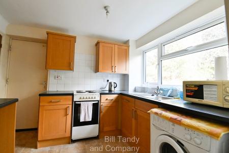 2.79m x 2.37m (9' 2" x 7' 9") having pre-formed work surface space with base storage cupboards and drawers, matching wall mounted storage cupboards, single drainer sink unit with mixer tap, space and plumbing for washing machine, space for electric cooker, UPVC double glazed window to rear, ceramic tiled splashbacks, space for fridge and freezer, under stairs pantry store cupboard and door to the garage.