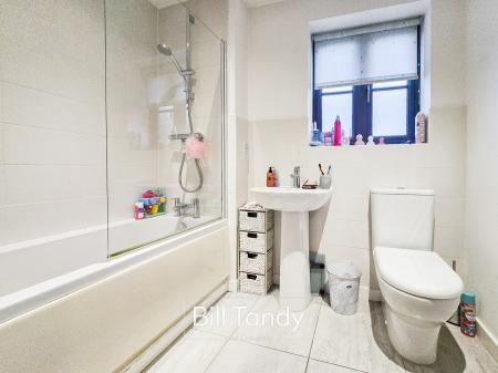 Modern white suite comprises a wash hand basin, low flush w.c., bath with shower over, tiled splashbacks double glazed rear window chrome towel rail and tiled floor.