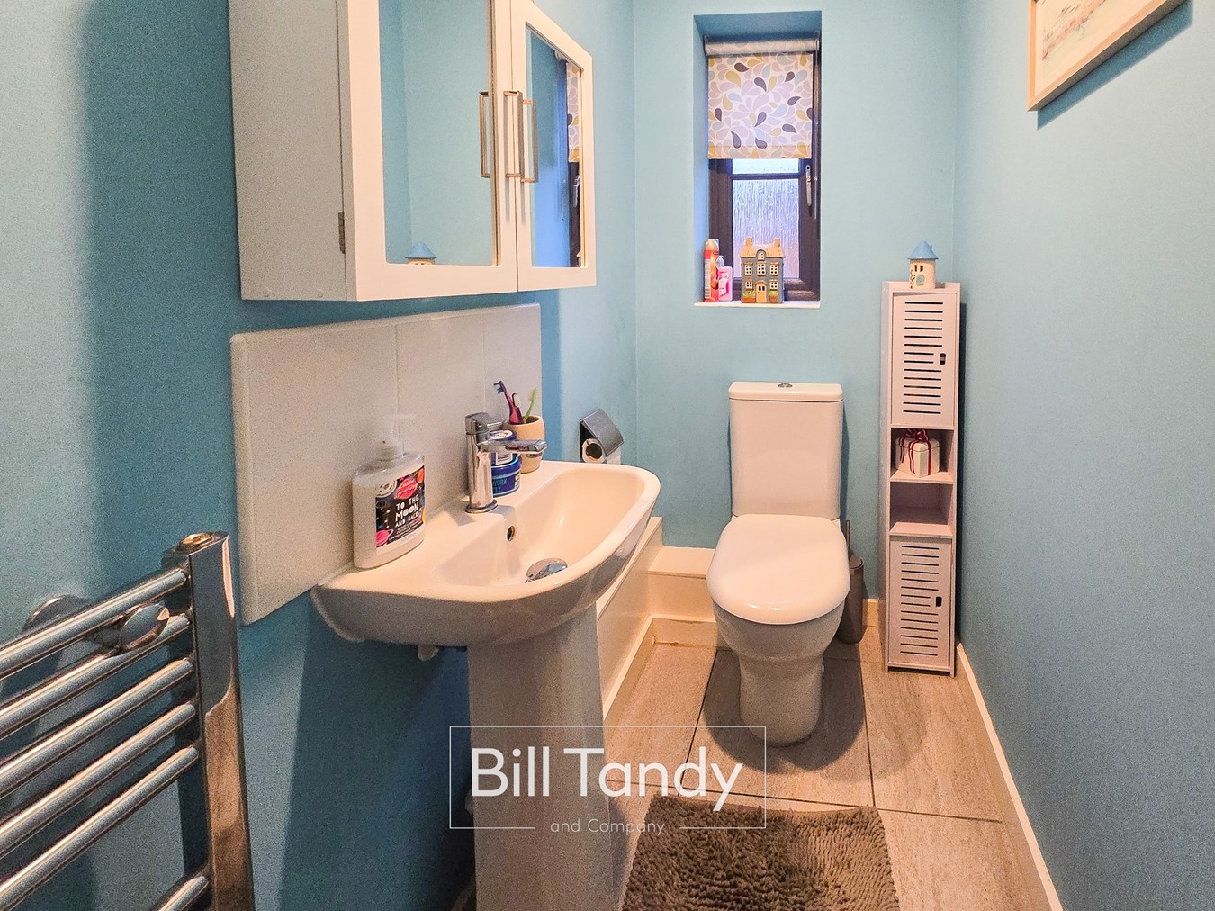 Modern white suite comprises a wash hand basin, low flush w.c., shower cubicle with shower over, tiled splashbacks double glazed rear window, chrome towel rail and tiled floor