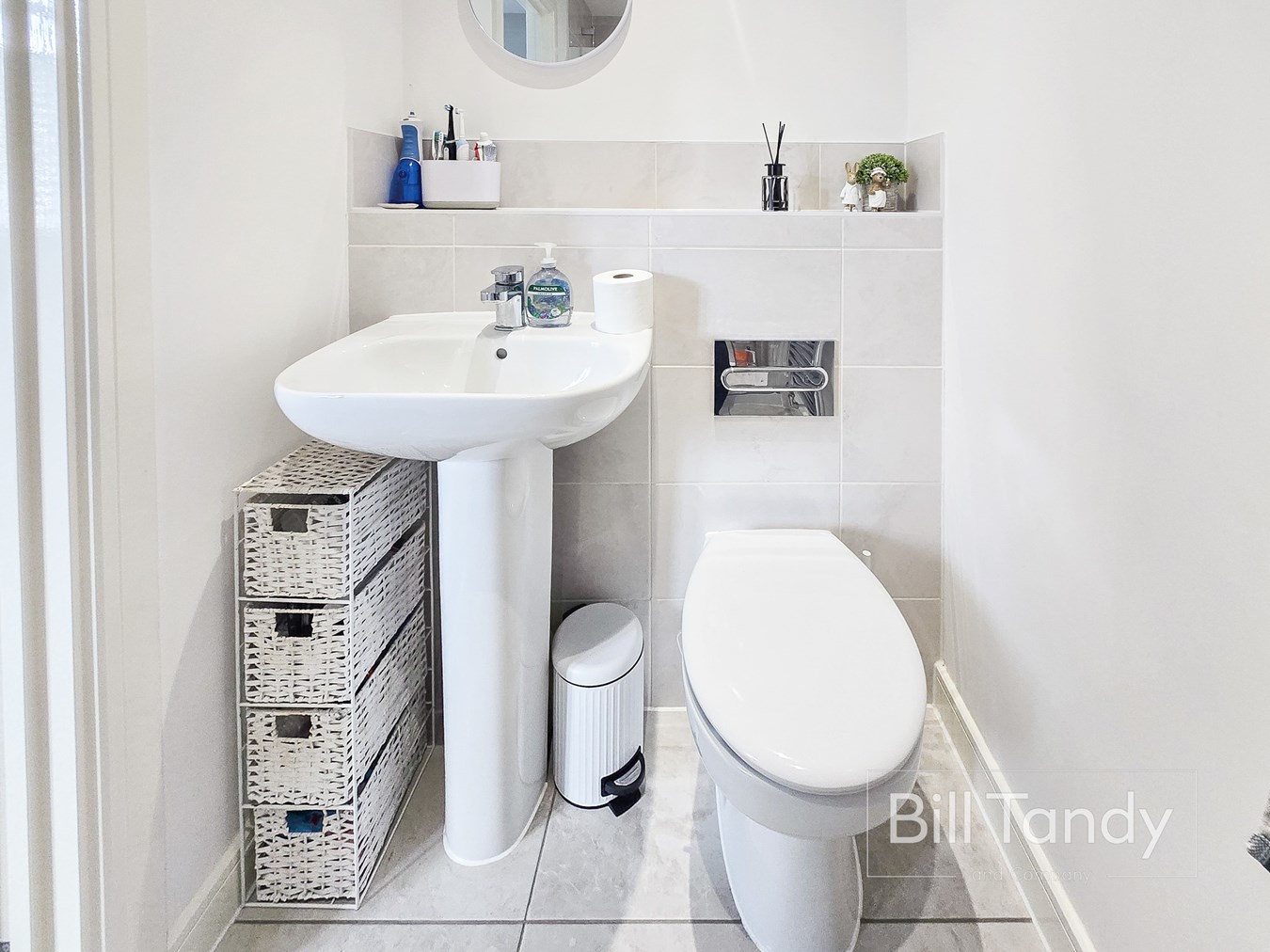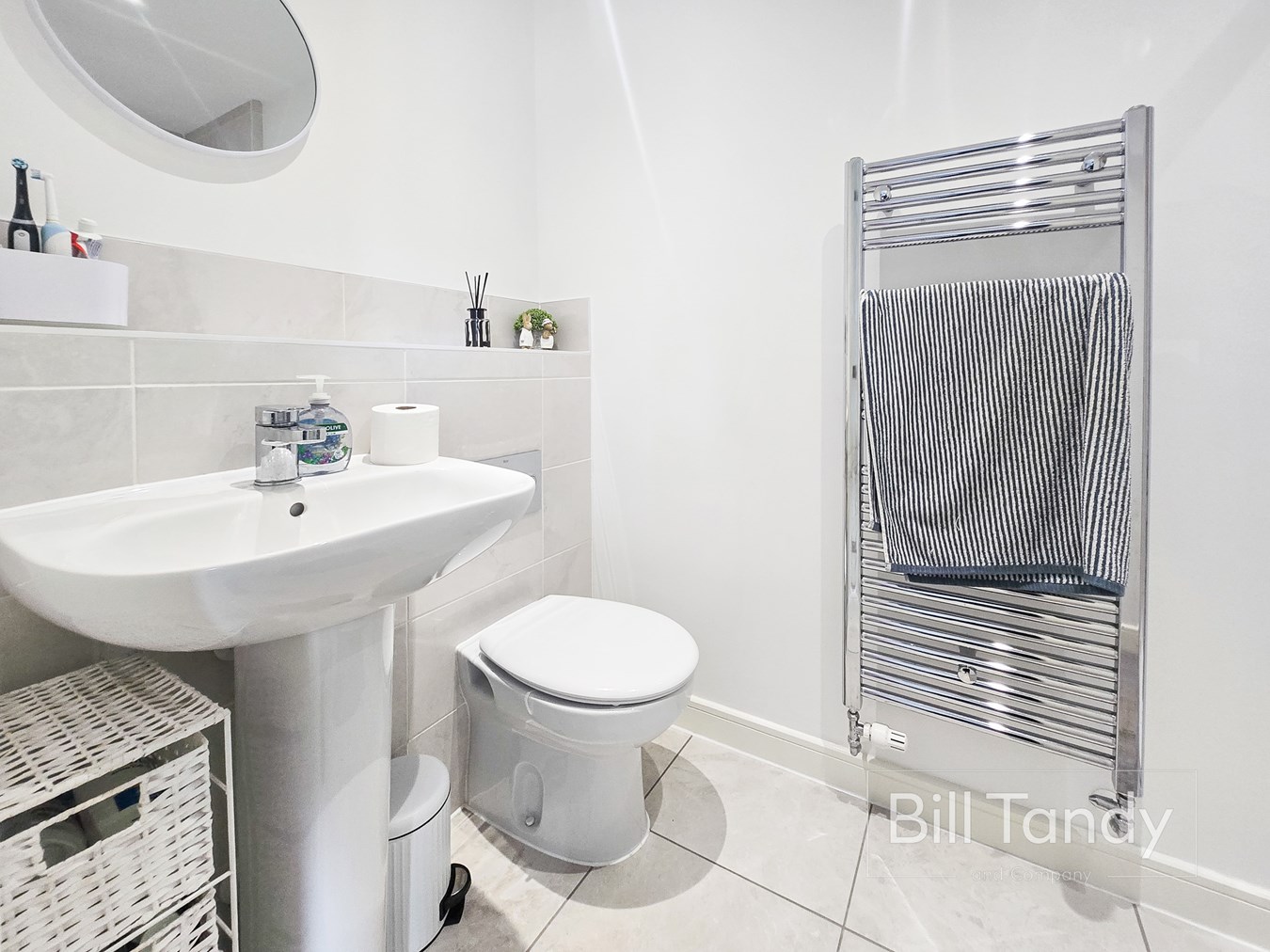 having tiled floor, radiator and a modern white suite comprising pedestal wash hand basin with half ceiling height tiled surround and low flush W.C.