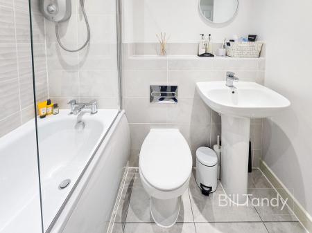 having tiled floor, radiator, ceiling spotlighting and modern white suite comprising pedestal wash hand basin with tiled surround and ledge, low flush W.C. and bath with electric shower above and with shower screen.