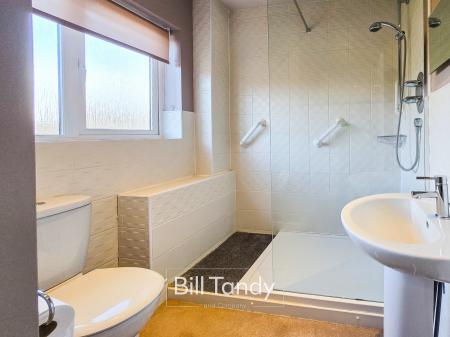 2.51m x 1.92m (8' 3" x 6' 4") having obscure double glazed window to rear, modern white suite comprising pedestal wash hand basin with tiled surround, low flush W.C. and generously sized shower enclosure with glass screen and shower appliance over, chrome heated towel rail and spotlighting.