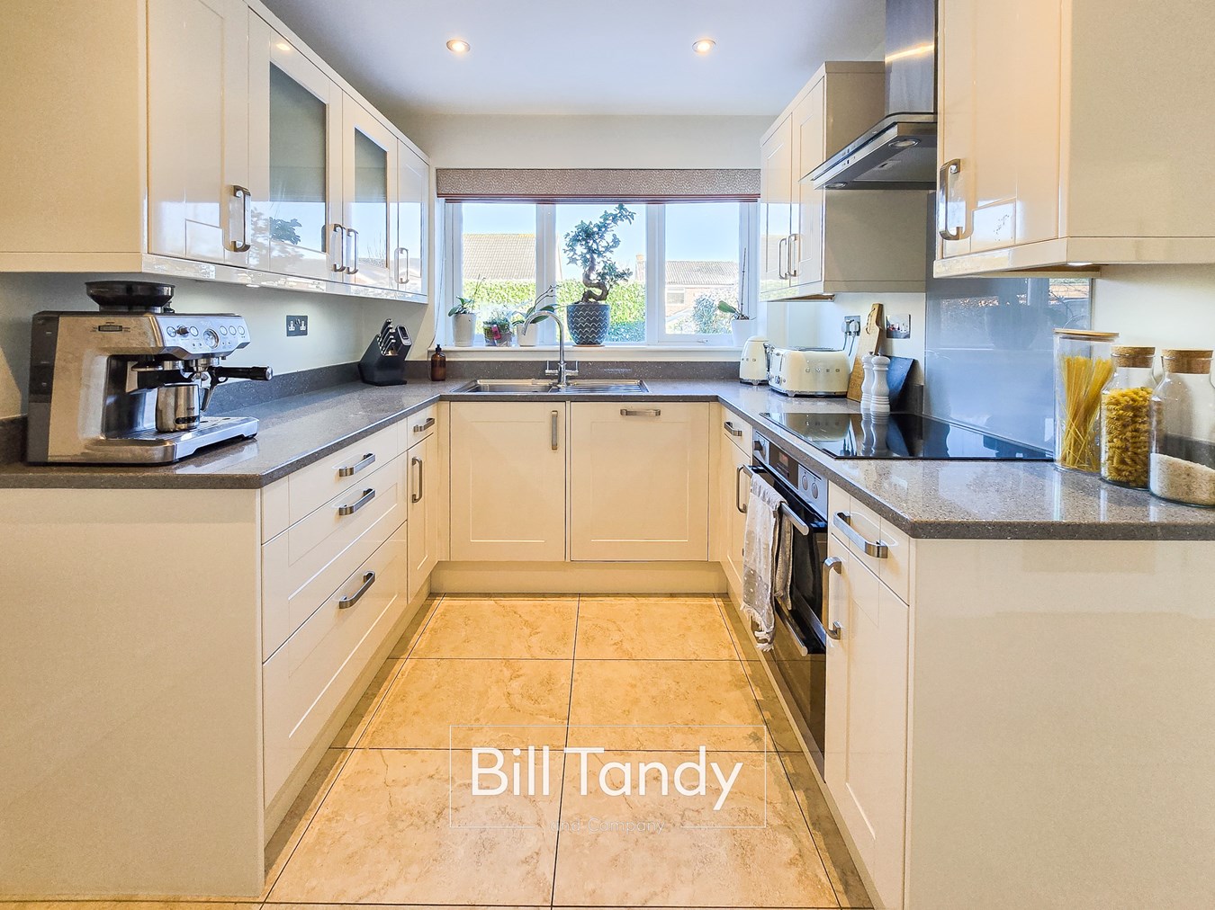 3.93m max x 2.39m (12' 11" max x 7' 10") having a feature tiled floor, double glazed window to rear, ceiling spotlighting, useful under stairs storage cupboard, high gloss units comprising base cupboards and drawers with quartz preparation work tops above, wall mounted cupboards with under-cupboard lighting, inset stainless steel sink and drainer, inset AEG double oven and grill with induction hob above, glass splashback surround and extractor fan, integrated dishwasher and fridge/freezer and door opens to: