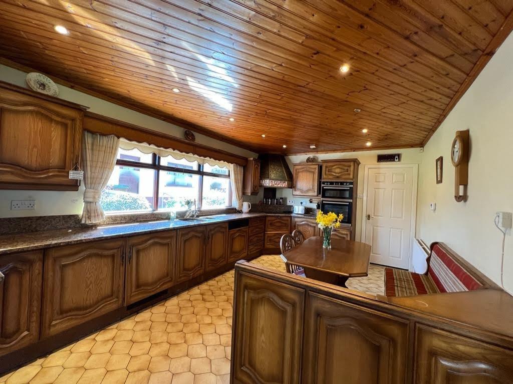 5.31m x 3.35m (17'5" x 11') - Having range of eye and low level units, glazed display cupboards, granite worktop and splashback, hob, double oven, extractor canopy, integrated dishwasher, dining space, recessed ceiling lighting, tiled floor.