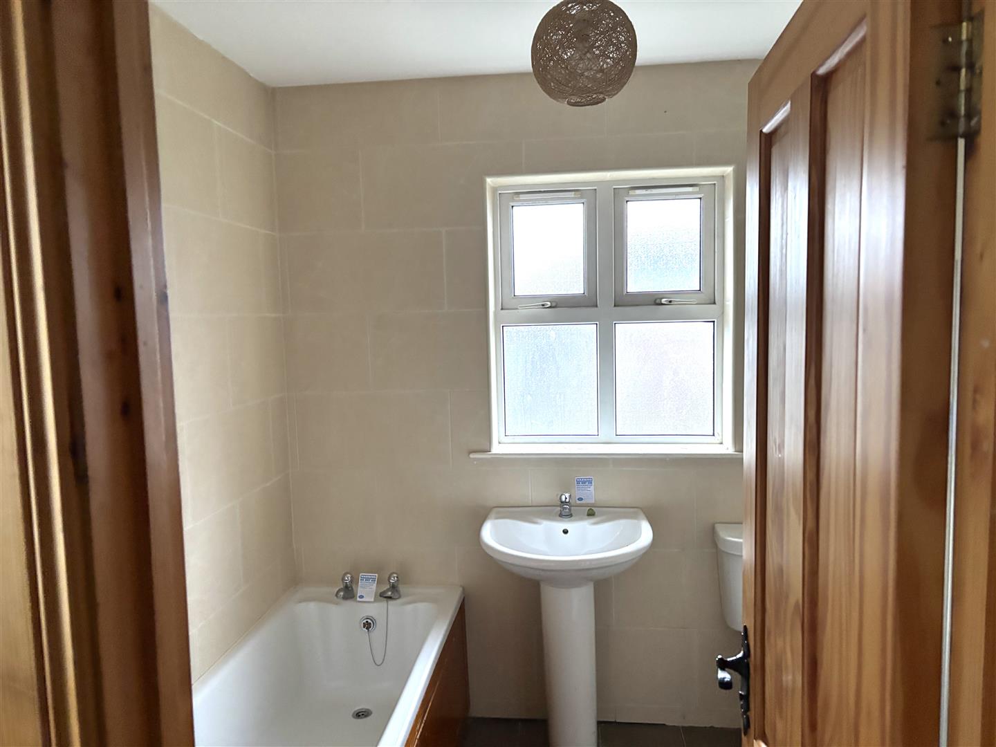 Bathroom: - 2.3 x 2.1 (7'6" x 6'10") - With a fitted white bath, pedestal wash hand basin and a Low Flush W.C. Fully tiled shower cubicle with electric shower. Extractor fan. Tiled flooring. Tiled walls.