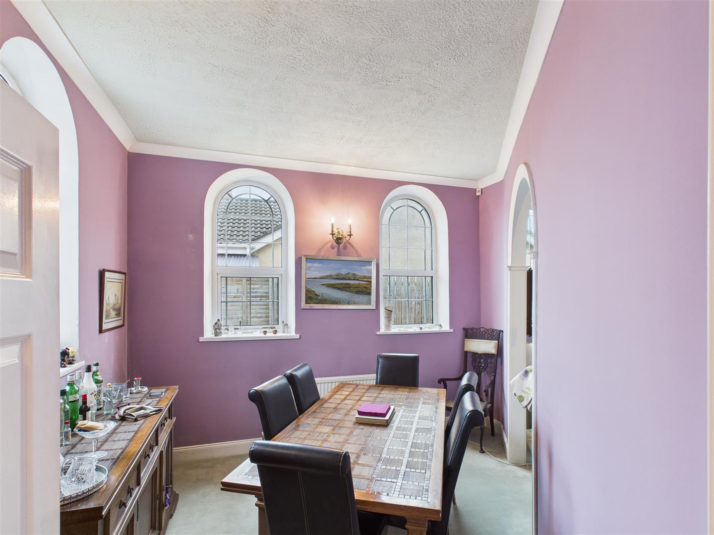 Dining Room: - 3.8 x 3.5 (12'5" x 11'5") - Feature arch windows, carpet flooring and coving around ceiling.