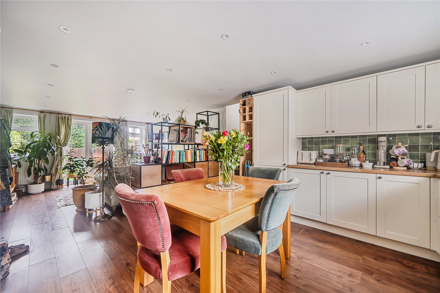 The ground floor is arranged as a generous open-plan living space. The kitchen/dining area occupies the front of the property and is fitted with a modern range of shaker-style units and integrated appliances, with ample room for a dining table. To the rear, the sitting area enjoys excellent natural light and features double doors opening directly onto the enclosed west-facing garden, making it ideal for both everyday living and entertaining.