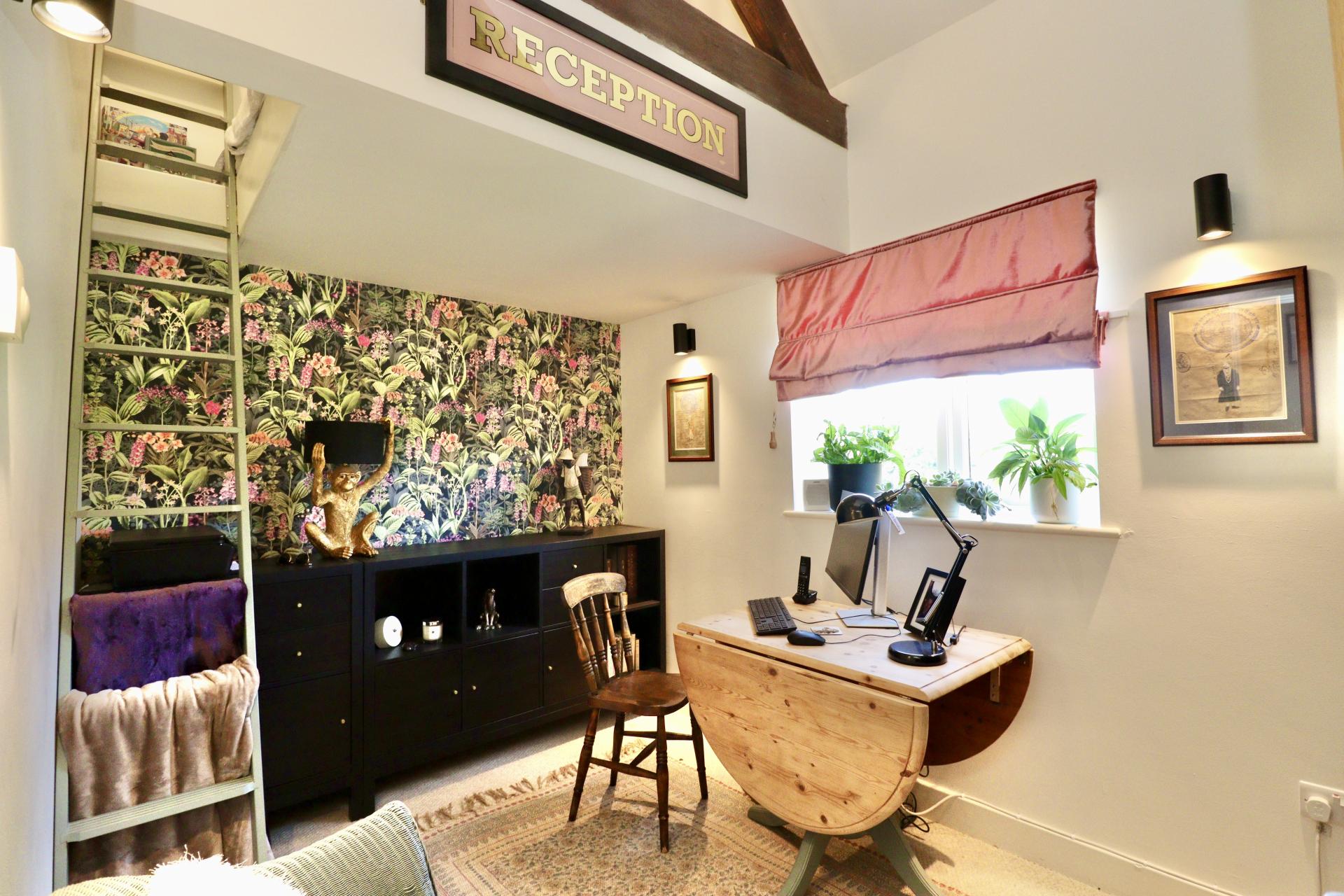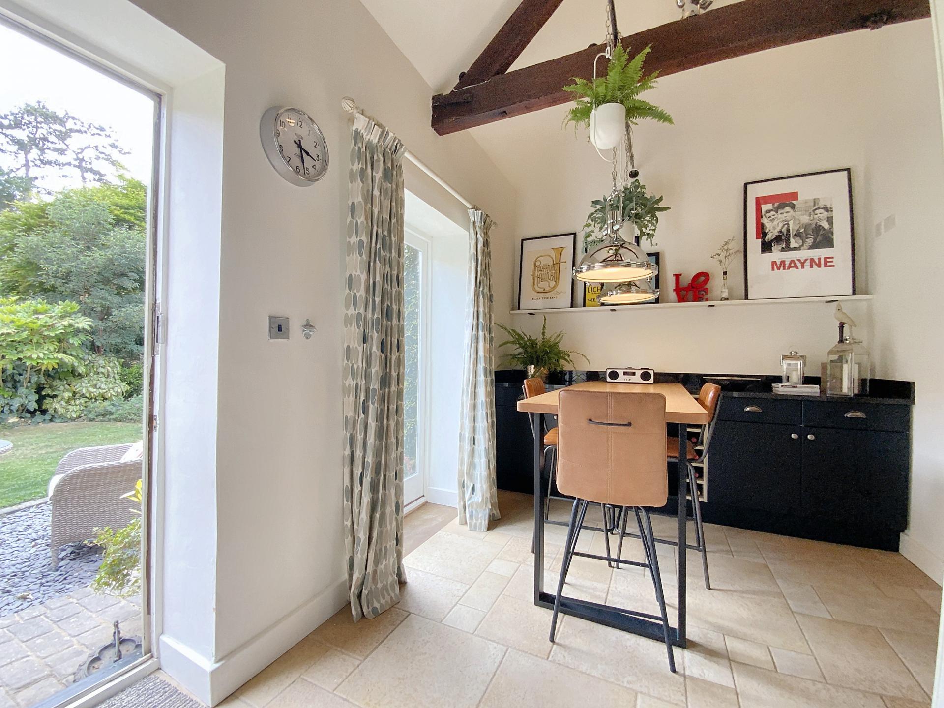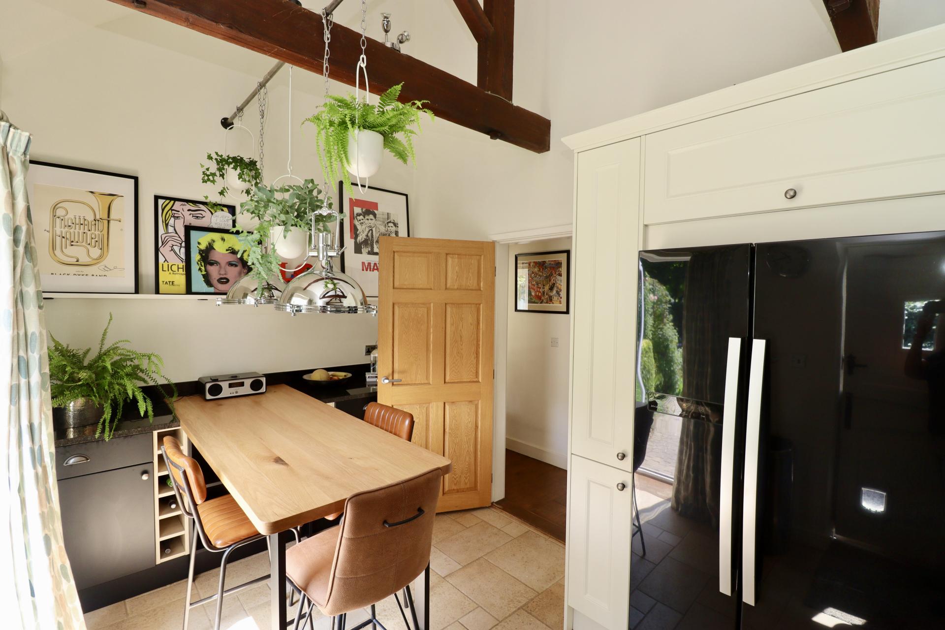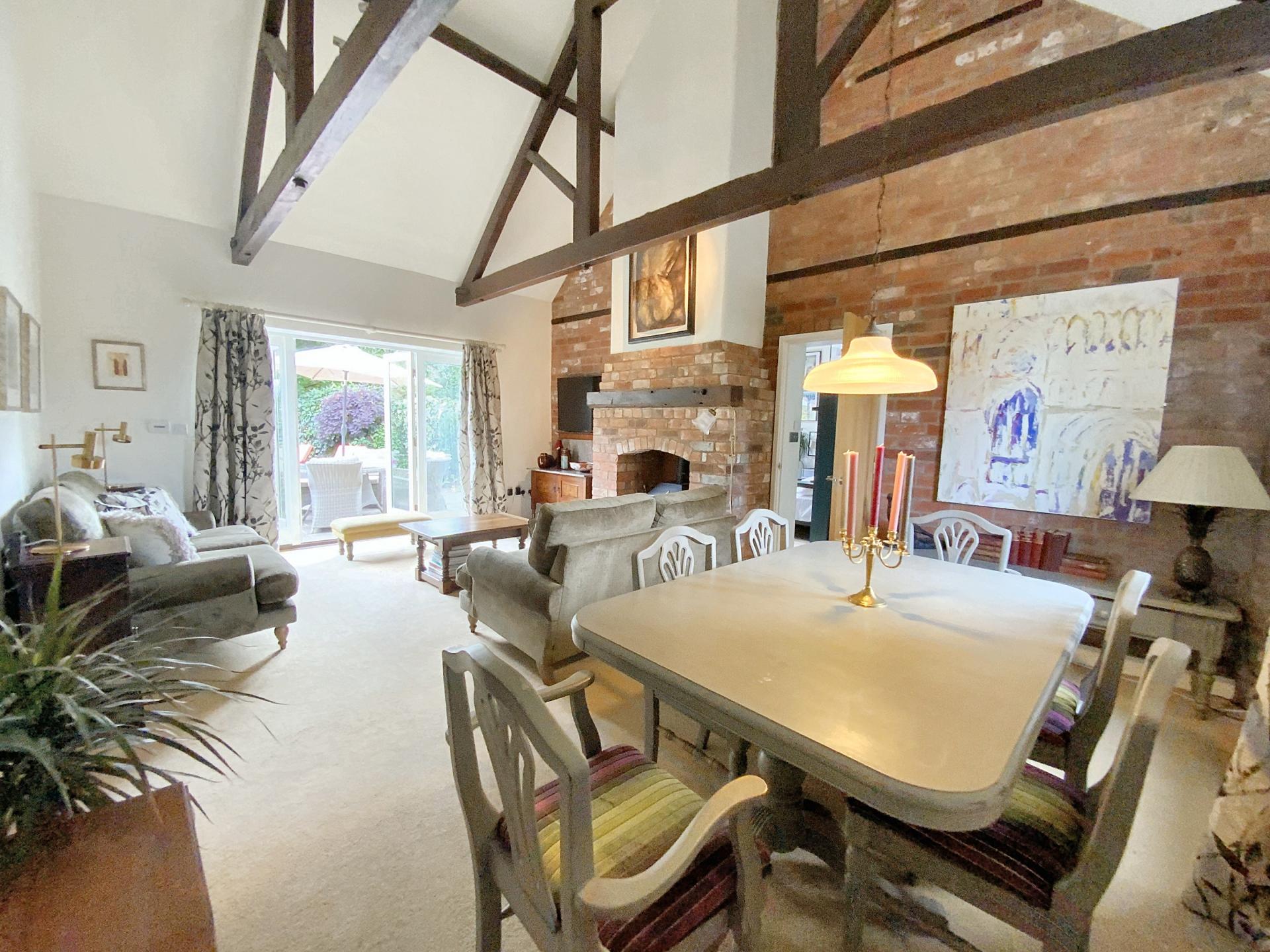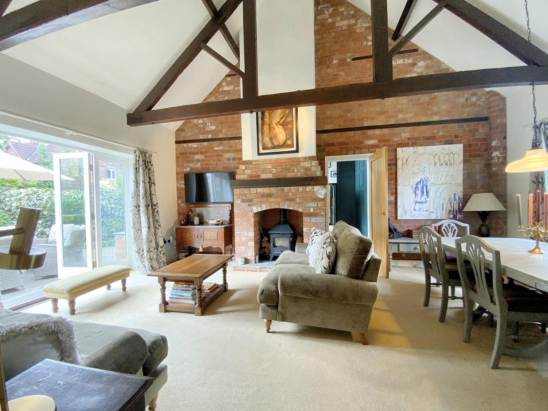 - Impressive full-height lounge with exposed beams and log burner