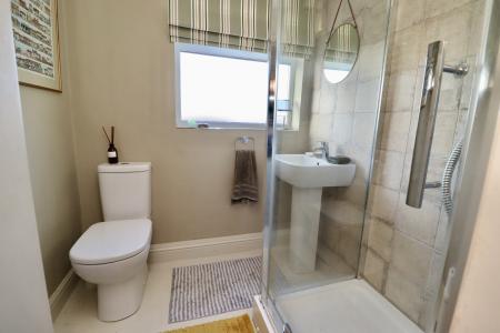 SHOWER ROOM Fitted with a three piece suite comprising of shower cubicle, close coupled WC and pedestal wash hand basin, airing cupboard housing the gas fired central heating boiler, tiled splashbacks and double glazed window to the rear aspect.