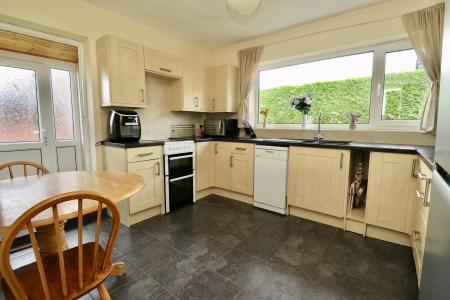 KITCHEN 11' 8" x 10' 4" (3.56m x 3.15m) Fitted with a range of wall and base units with work surfaces over, 1 1/2 bowl sink with side drainer and mixer tap over, spaces for fridge freezer, cooker and slimline dishwasher, tiled flooring and splashbacks, radiator and double glazed window to the side aspect.