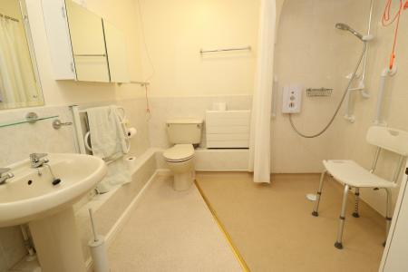 WET ROOM 8' 2" x 8' 0" (2.49m x 2.44m) Fitted with a three piece suite comprising of wet room shower, close coupled WC and pedestal wash hand basin, part-tiled walls, radiator and heated towel rail.