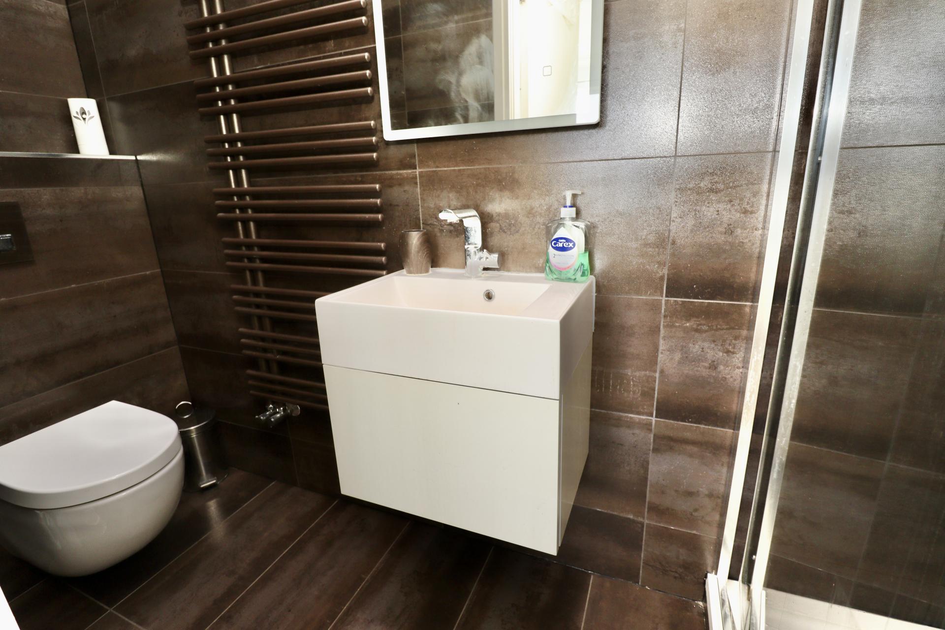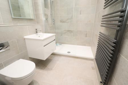 BATHROOM Fitted with a three piece suite comprising of walk-in shower cubicle, wall mounted wash hand basin and close coupled WC, towel radiator, tiled walls and flooring and spotlights.
