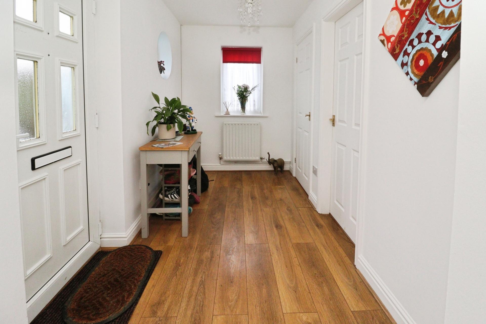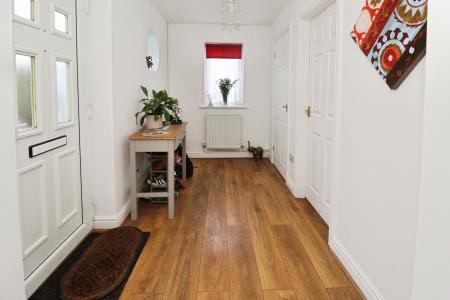 HALL With staircase to the first floor, laminate flooring, storage cupboard, double glazed window to the front aspect, feature decorative porthole window and radiator.