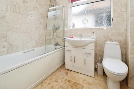 BATHROOM Fitted with a three piece suite comprising of panelled bath with shower over, wash hand basin in a vanity style unit and close coupled WC, chrome towel radiator, tiled walls and flooring and double glazed window to the side aspect.