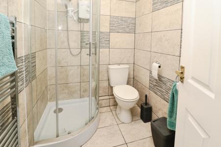 SHOWER ROOM Fitted with a three piece suite comprising of shower cubicle, wash hand basin in a vanity style unit and close coupled WC, chrome towel radiator, tiled walls and flooring.