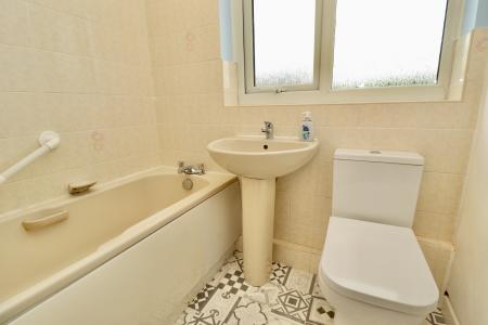 BATHROOM Fitted with a three piece suite comprising of panelled bath with shower over, close coupled WC and pedestal wash hand basin, part tiled walls, airing cupboard, radiator and double glazed window to the rear aspect.