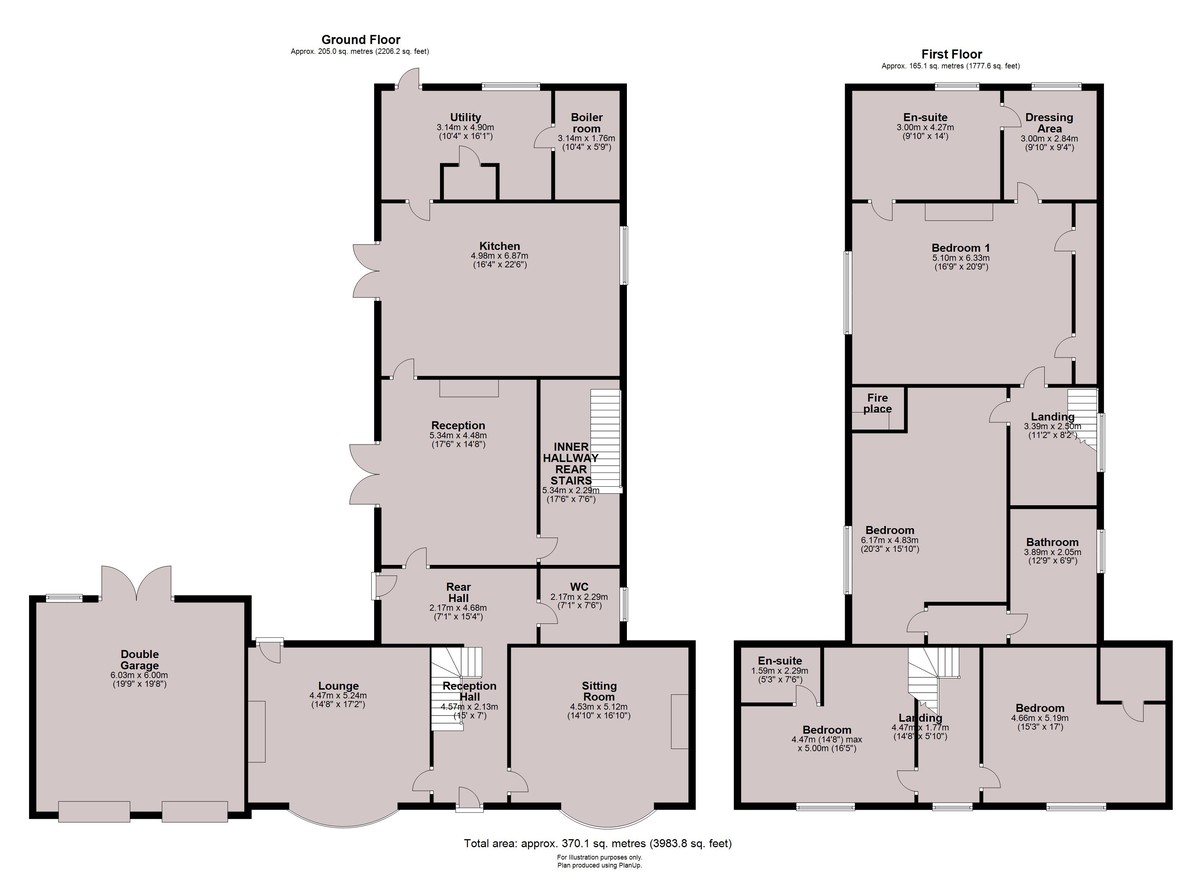 DOUBLE GARAGE 19' 9" x 19' 8" (6.03m x 6.00m) , with two doors to the front, double doors and window to the rear, power and lighting.