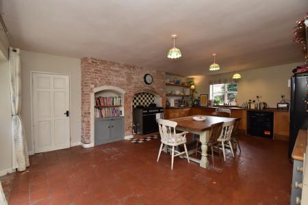 KITCHEN 16' 4" x 22' 6" (4.98m x 6.87m) , with window to the side aspect, double doors to the rear garden, tiled flooring, fitted with base units with wooden work surfaces overs, ceramic sink unit and drainer, range cooker and spaces for fridge and dishwasher.