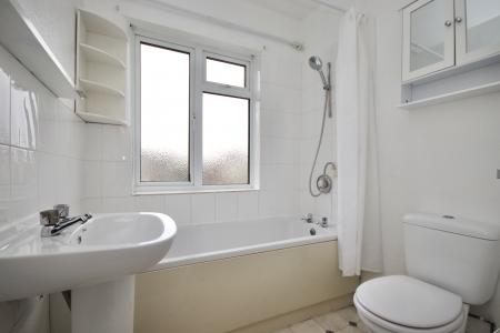BATHROOM 5' 11" x 5' 10" (1.82m x 1.78m) Fitted with a three-piece suite comprising of panelled bath with shower over, pedestal wash hand basin and close coupled WC, tiled splashbacks, radiator and double glazed window to the front aspect.