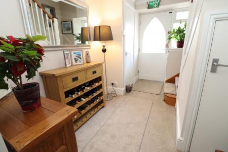 REAR HALL With cupboard housing the gas fired central heating boiler, laminate flooring, radiator, double glazed window to the rear aspect and door to the side garden.