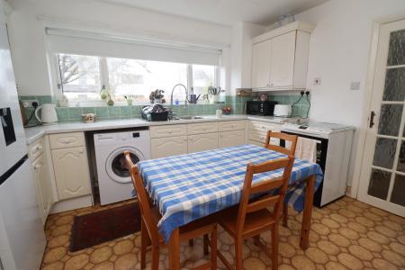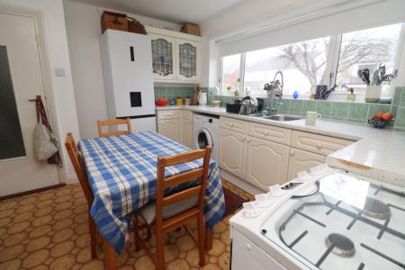 KITCHEN 12' 3" x 12' 3" (3.75m x 3.74m) Fitted with a range of wall and base units with work surfaces over, stainless steel 1 1/2 bowl sink with side drainer and mixer tap over, spaces for cooker, washing machine and fridge freezer, tiled splashbacks, radiator and double glazed window to the front aspect.