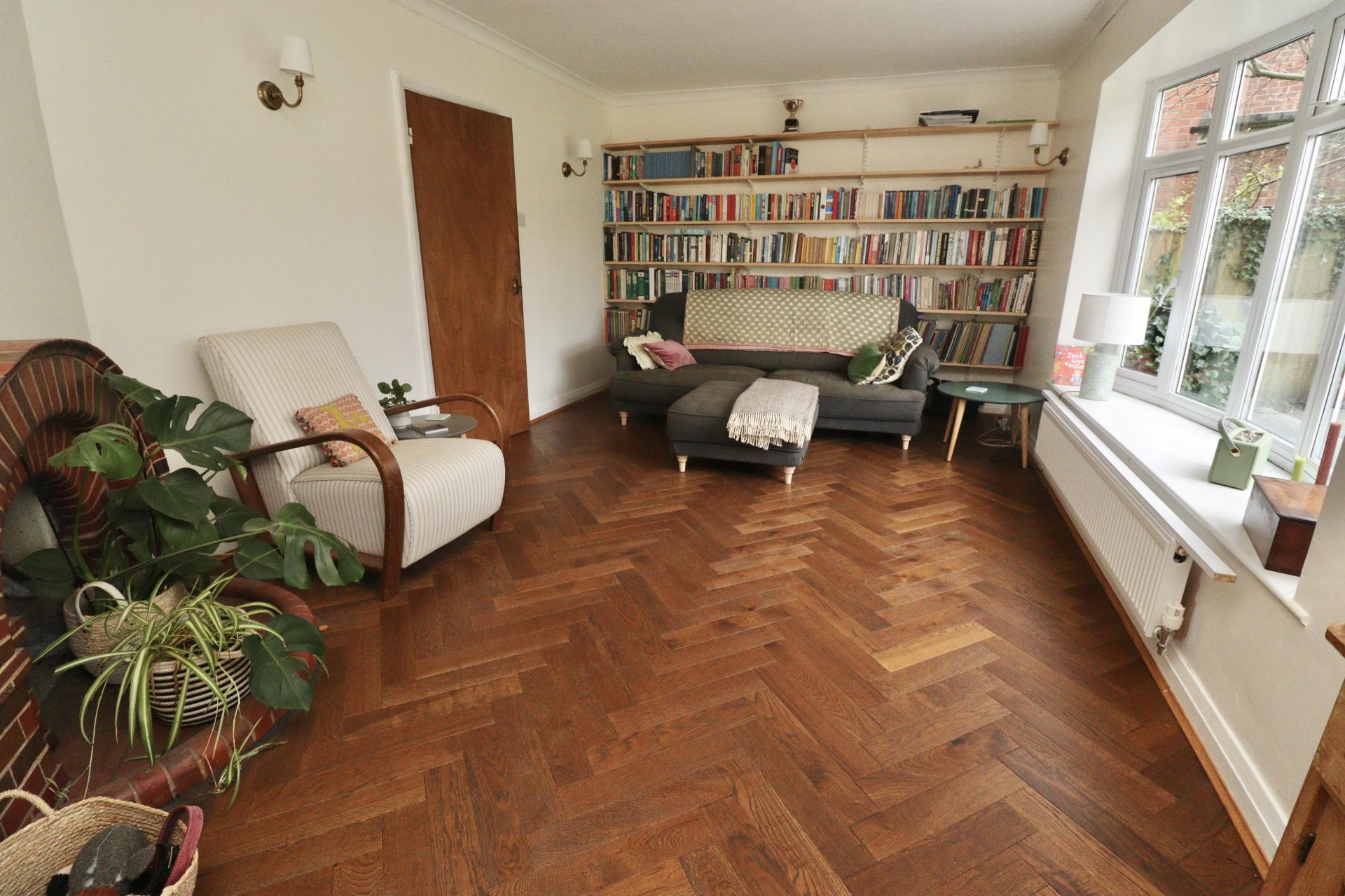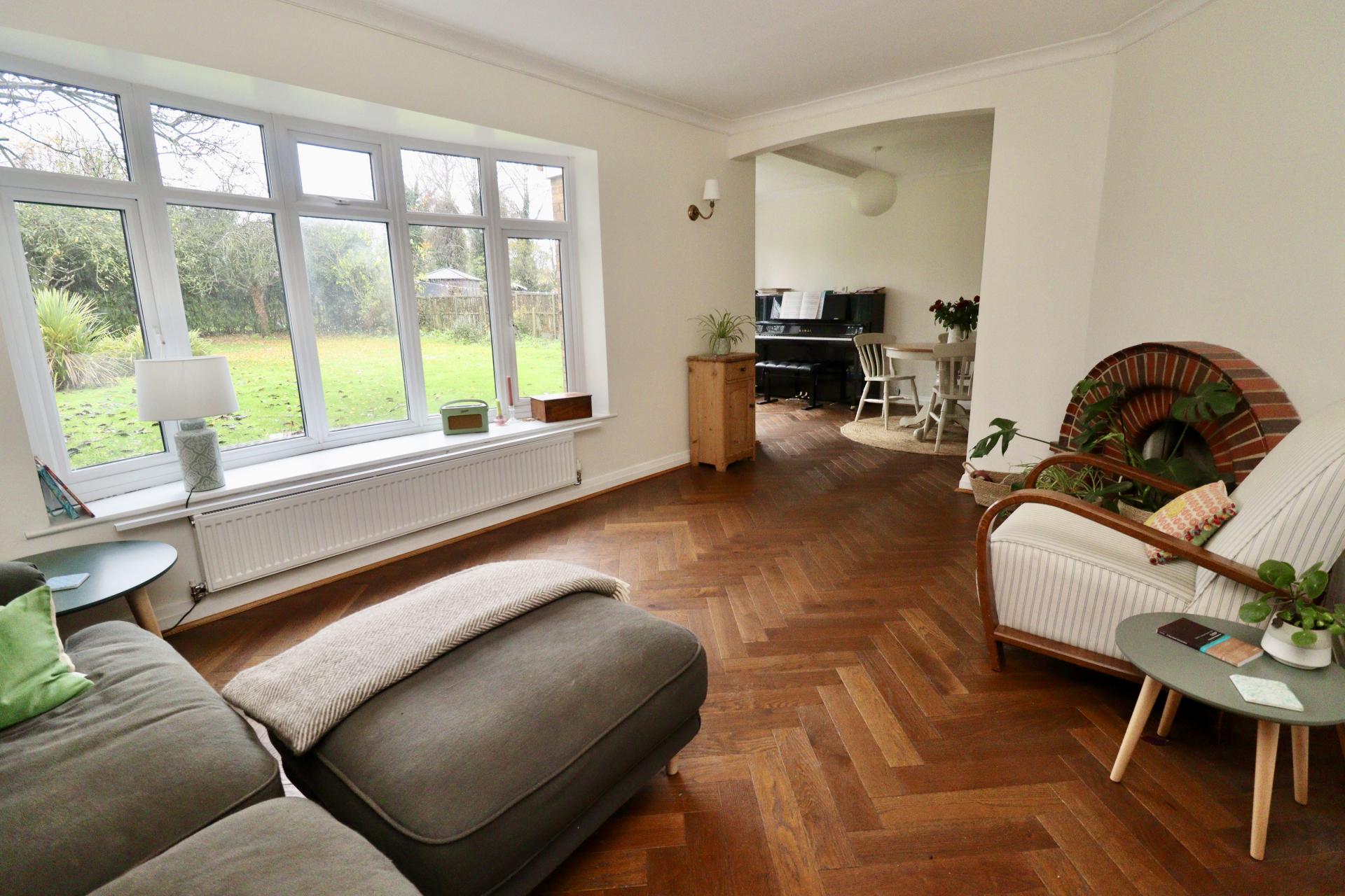 LOUNGE 16' 4" x 10' 11" (4.99m x 3.33m) With double glazed bow window to the rear aspect, brick fireplace, parquet flooring and radiator.