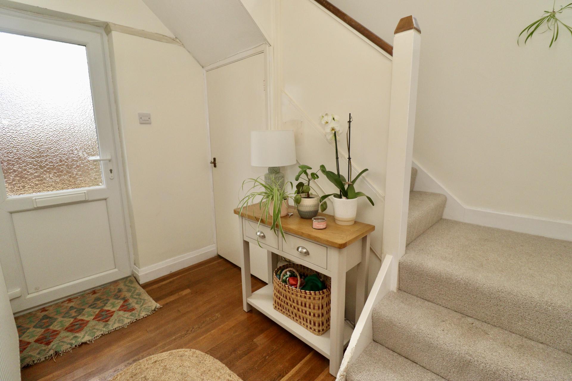ENTRANCE HALL With staircase to the first floor, under stairs storage cupboard, wooden flooring and radiator.