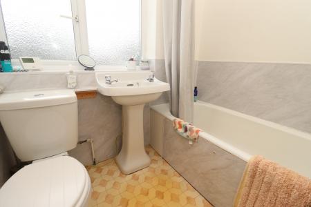 BATHROOM Fitted with a three piece suite comprising of panelled bath with shower over, close coupled WC and pedestal wash hand basin, chrome towel radiator, airing cupboard and double glazed window to the front aspect.