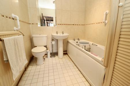 BATHROOM Fitted with a three piece suite comprising of panelled bath, pedestal wash hand basin and close coupled WC, airing cupboard, radiator, tiled walls and flooring.