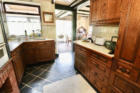 KITCHEN/DINER 19' 10 (max)" x 19' 1 (max)" (6.05m x 5.82m) Fitted with a range of wall and base units with work surfaces over, sink with side drainer and mixer tap over, gas hob, eye level electric oven, tiled flooring and splashbacks, radiator, double glazed windows to the side and rear aspects and double glazed sliding patio doors to the rear garden.