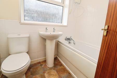 BATHROOM Fitted with a three piece suite comprising of panelled bath with shower over, pedestal wash hand basin and close coupled WC, tiled walls, radiator and double glazed window to the side aspect.