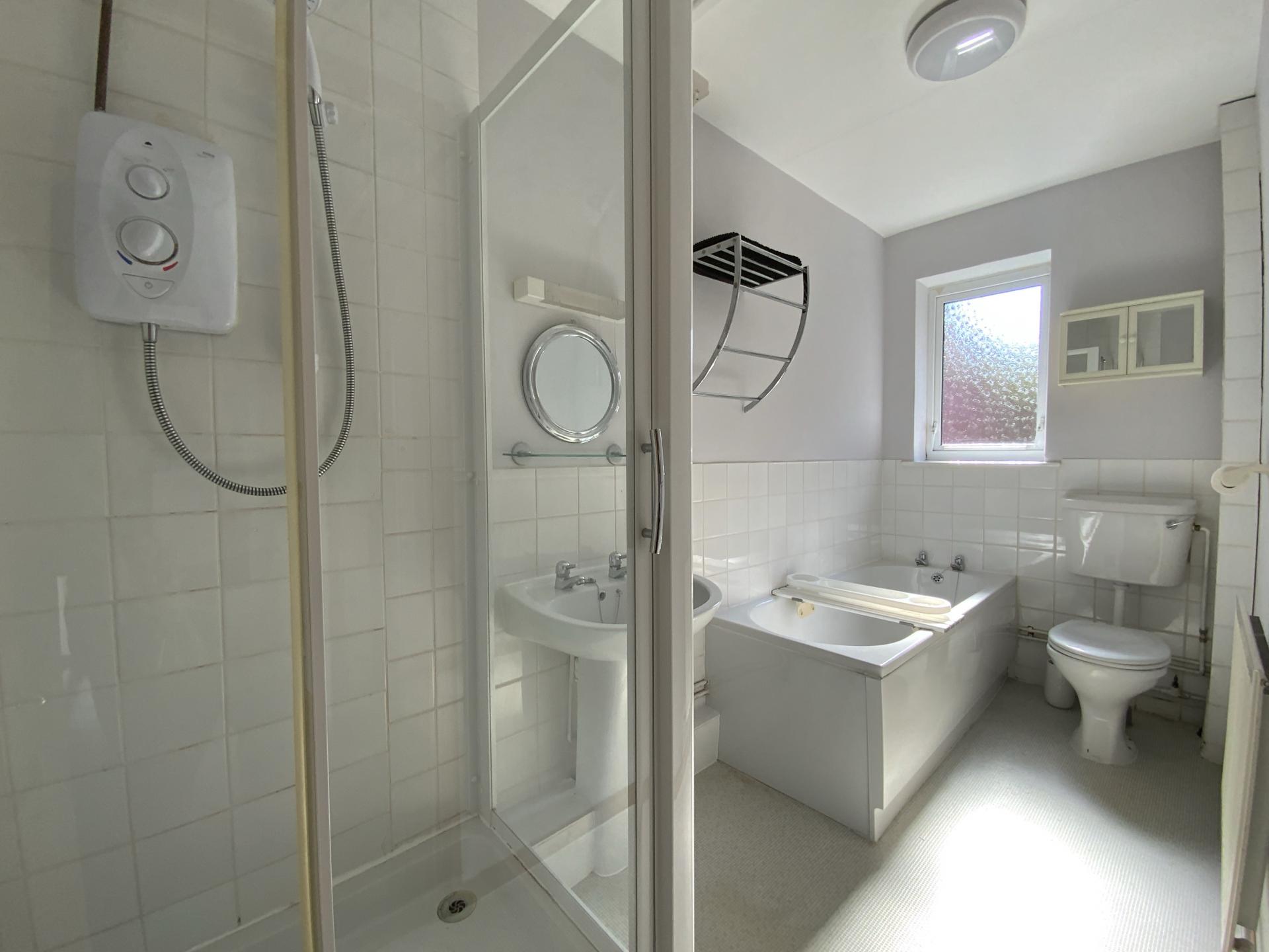BATHROOM Fitted with a four piece suite comprising of shower cubicle with electric shower, panelled bath, close couple WC and pedestal wash hand basin, part tiled walls, radiator and double glazed window to the side aspect.