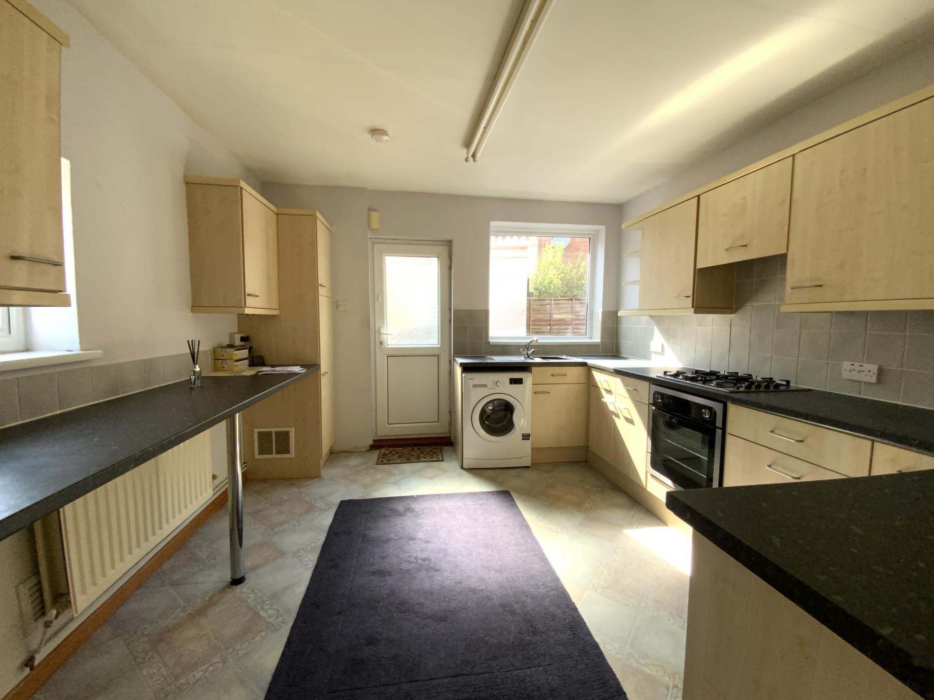 KITCHEN 11' 10" x 11' 4" (3.62m x 3.46m) Fitted with a range of base and wall units with work surfaces over, stainless steel sink with side drainer and mixer tap over, electric oven and gas hob with extractor fan over, spaces for a washing machine and fridge, tiled splash-backs, radiator, double glazed windows to the side and rear aspects and door to the side aspect.