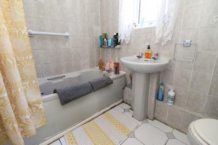 BATHROOM Fitted with a three piece suite comprising of panelled bath with shower over, close coupled WC and pedestal wash hand basin, tiled walls and floor, radiator and double glazed window to the side aspect.
