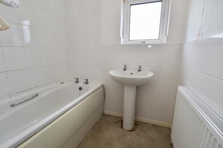 BATHROOM Fitted with a three piece suite comprising of panelled bath with electric shower and pedestal wash hand basin, part-tiled walls, radiator and double glazed window to the side aspect.